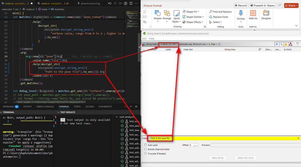 While Boudewijn Meijer and Rick Veldhoven do not do this, in my project, I also transpiled other sections of the executables, mainly .rdata (containing read only data such as strings) and .data (mainly containing global variables) ; into encrypted blob.