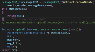HMODULE amsiBase = apicall<HMODULE(const char *)>::call(LoadLibraryA_fn, "amsi.dll");