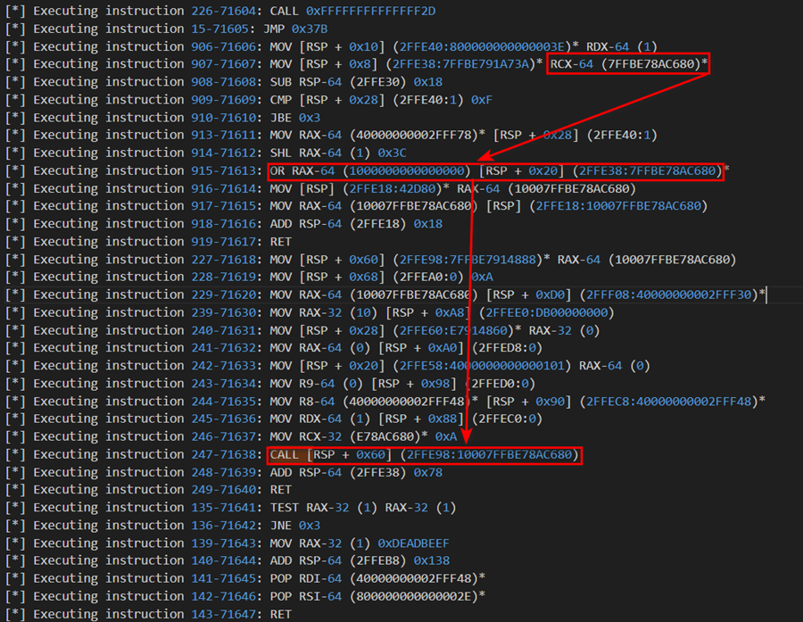 Another way of catching encrypted instructions is to wait for it to get stored decrypted in memory. This method is also ineffective: instructions are decrypted, executed, and re-encrypted one at a time. Unlike standard shellcode execution, there is never a window where a large decrypted payload exists in memory. Detection would require flagging a single instruction at the precise moment it is decrypted, or to reach a sensor post-decryption (e.g. going through a hooked VirtualAlloc function. We’ll explore later what evasion tools this approach enables against those sensors).