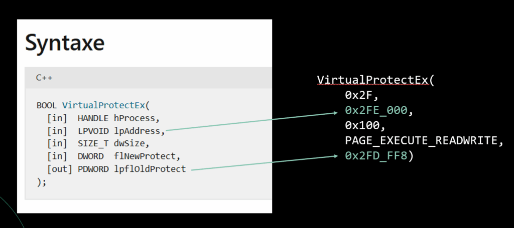 Now, if VirtualProtectEx got called from our MVM, the second and fifth argument, which are supposed to be native pointers, would get marshalled before calling the API: