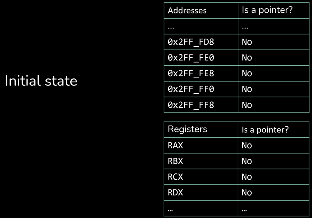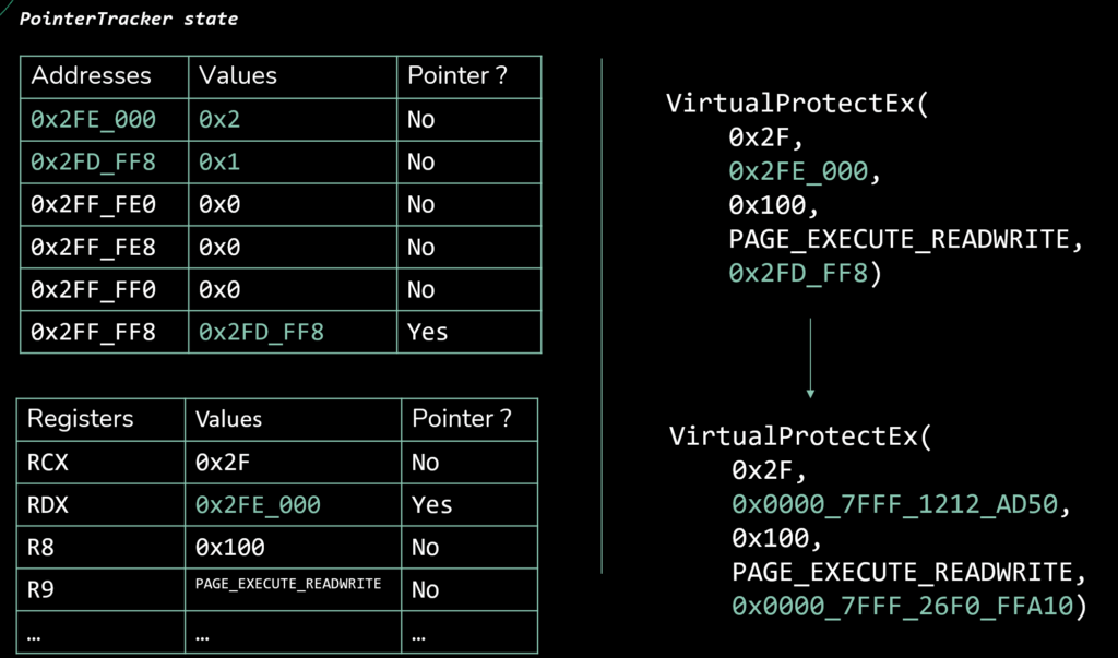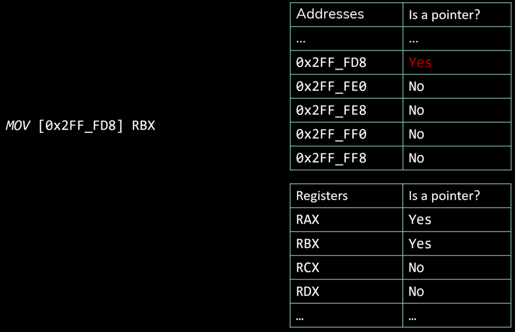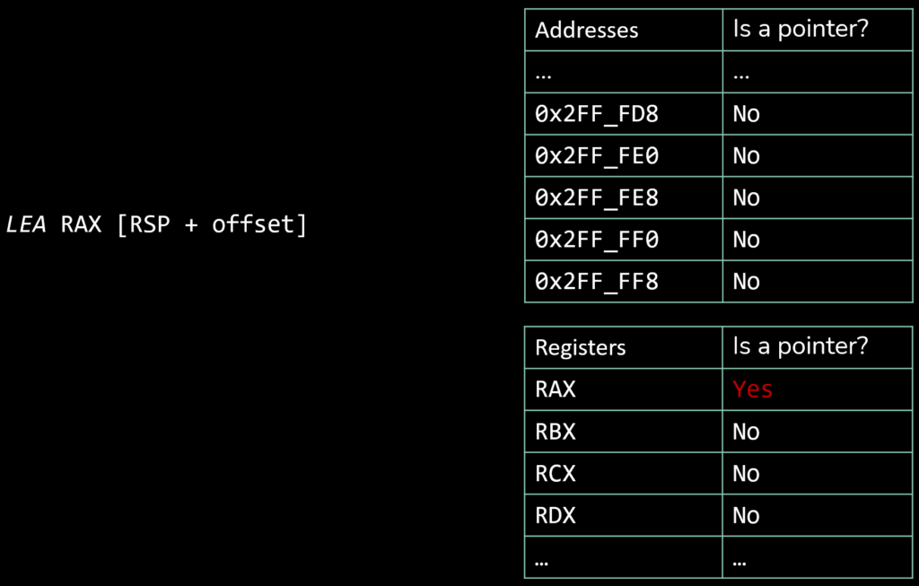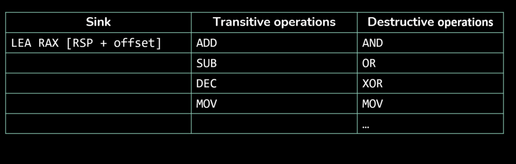 - Instructions that create stack pointers are used as sink, and their destination operand are marked as containing a pointer