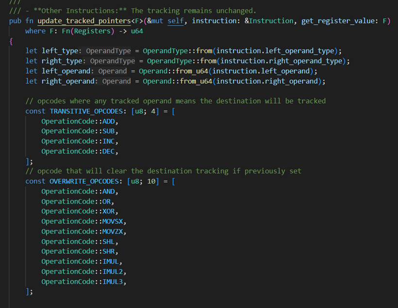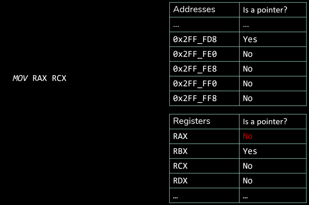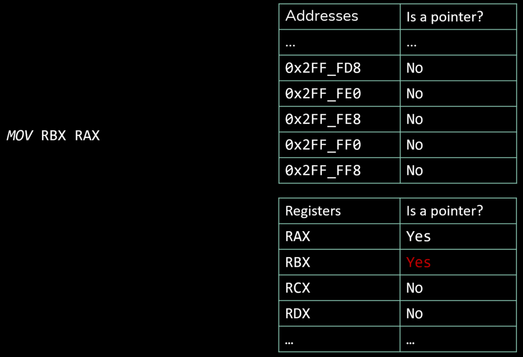 - A set of transitive operands is defined. If such an instruction is executed and its source operand is marked as a pointer, the destination operand is likewise marked as a pointer. Reciprocally, if the source operand is not marked as a pointer but its destination is, it will no longer be the case post execution.