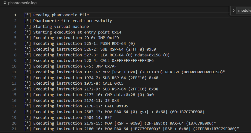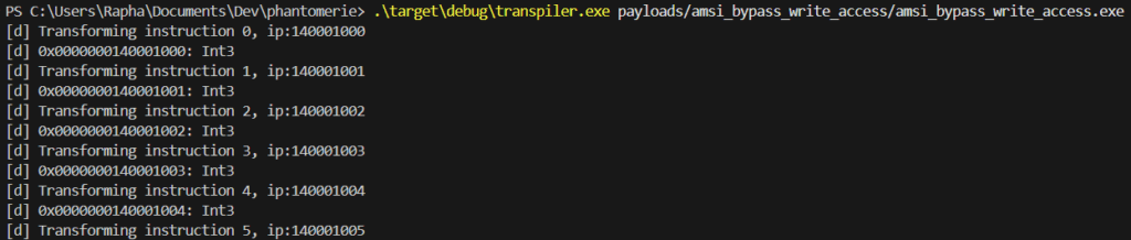 The transpilation is quite straightfoward. A PE is made of several sections, the one we’re the most interested with being the .text section, which contains the encoded assembly instructions executed by the CPU. Going from x86-64 instruction to a Phantomerie instruction (pinstruction for short) is the main objective of transpilation. This transformation operates as follow: